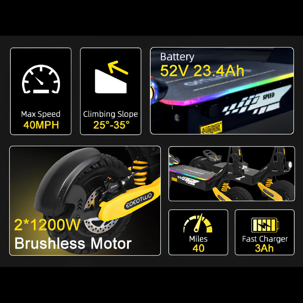 Equipped with a 2400W dual-drive motor (1200W × 2), it delivers powerful performance with ease, capable of climbing slopes with an angle of up to 35°. Combined with 11-inch off-road vacuum tires and front and rear spring suspension systems, it effortlessly handles challenging terrains such as sand, gravel, and mud, making outdoor adventures as smooth as riding on flat ground!
